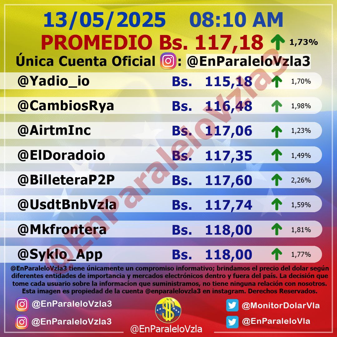 El dólar paralelo inició la jornada de este 13 de mayo con tendencia alcista al cotizarse en Bs. 117,18.