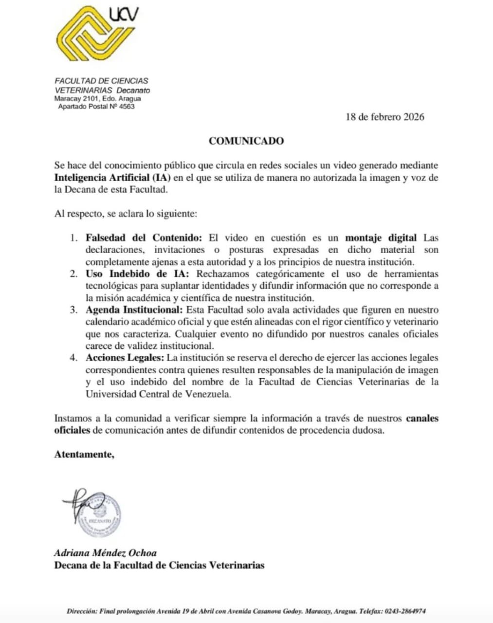 Además, advirtió sobre posibles consecuencias a este tipo de actos. «La institución se reserva el derecho de ejercer las acciones legales correspondientes contra quienes resulten responsables de la manipulación de imagen y el uso indebido del nombre de la Facultad de Ciencias Veterinarias de la Universidad Central de Venezuela».