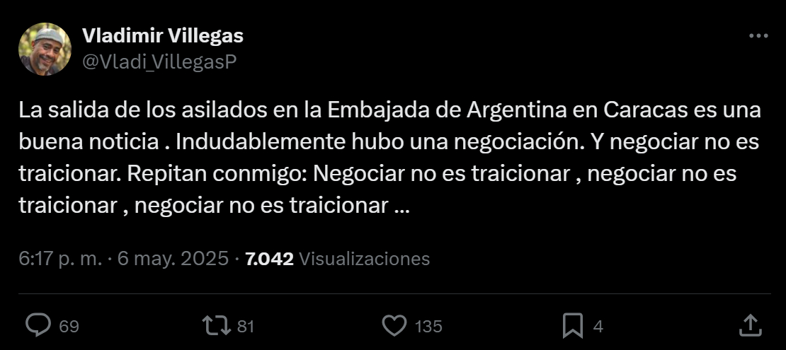 Por su parte, el periodista Vladímir Villegas afirmó en X (Twitter) que «indudablemente hubo una negociación» para conseguir que los opositores salieran de la Embajada. «Negociar no es traicionar», añadió.