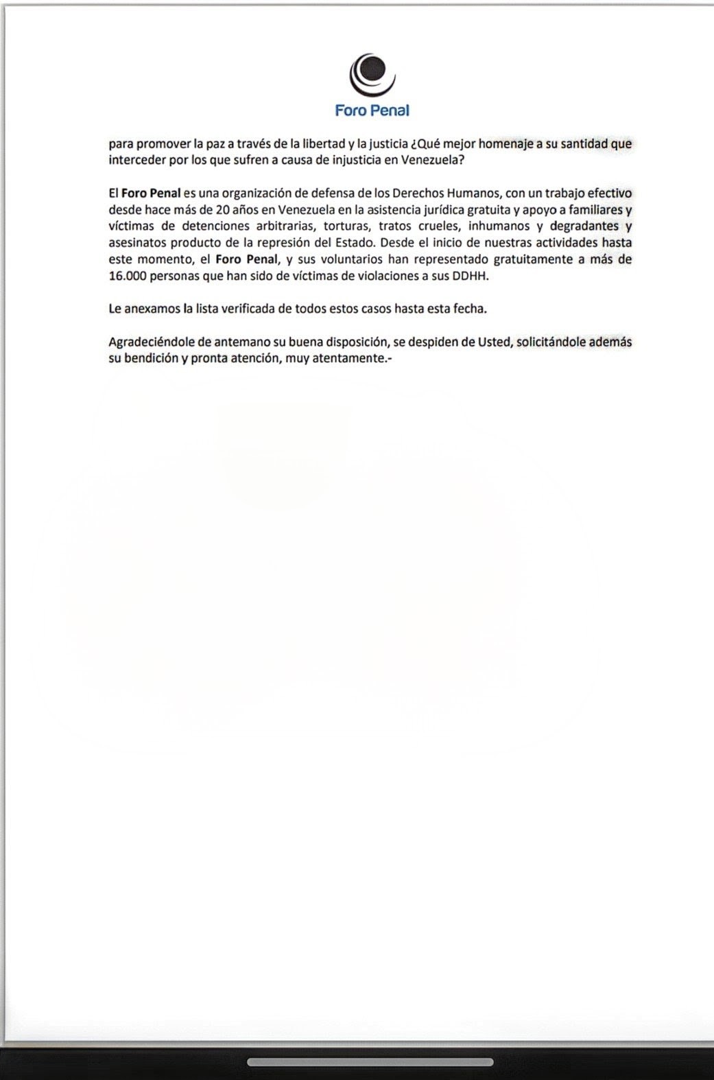 El Foro Penal envió una carta al papa León XIV solicitando su intervención para promover la liberación de los presos políticos en el país.