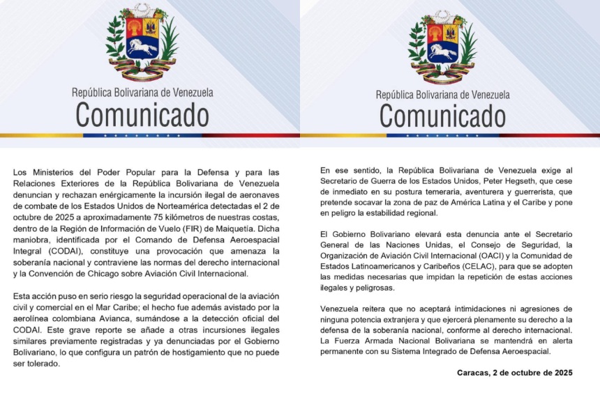 Las autoridades también acusaron al secretario de Guerra estadounidense, Peter Hegseth, que «cese de inmediato su postura temeraria, aventurera y guerrerista». En ese sentido, dijo que el incidente de los aviones «pretende socavar la zona de paz» de la región.