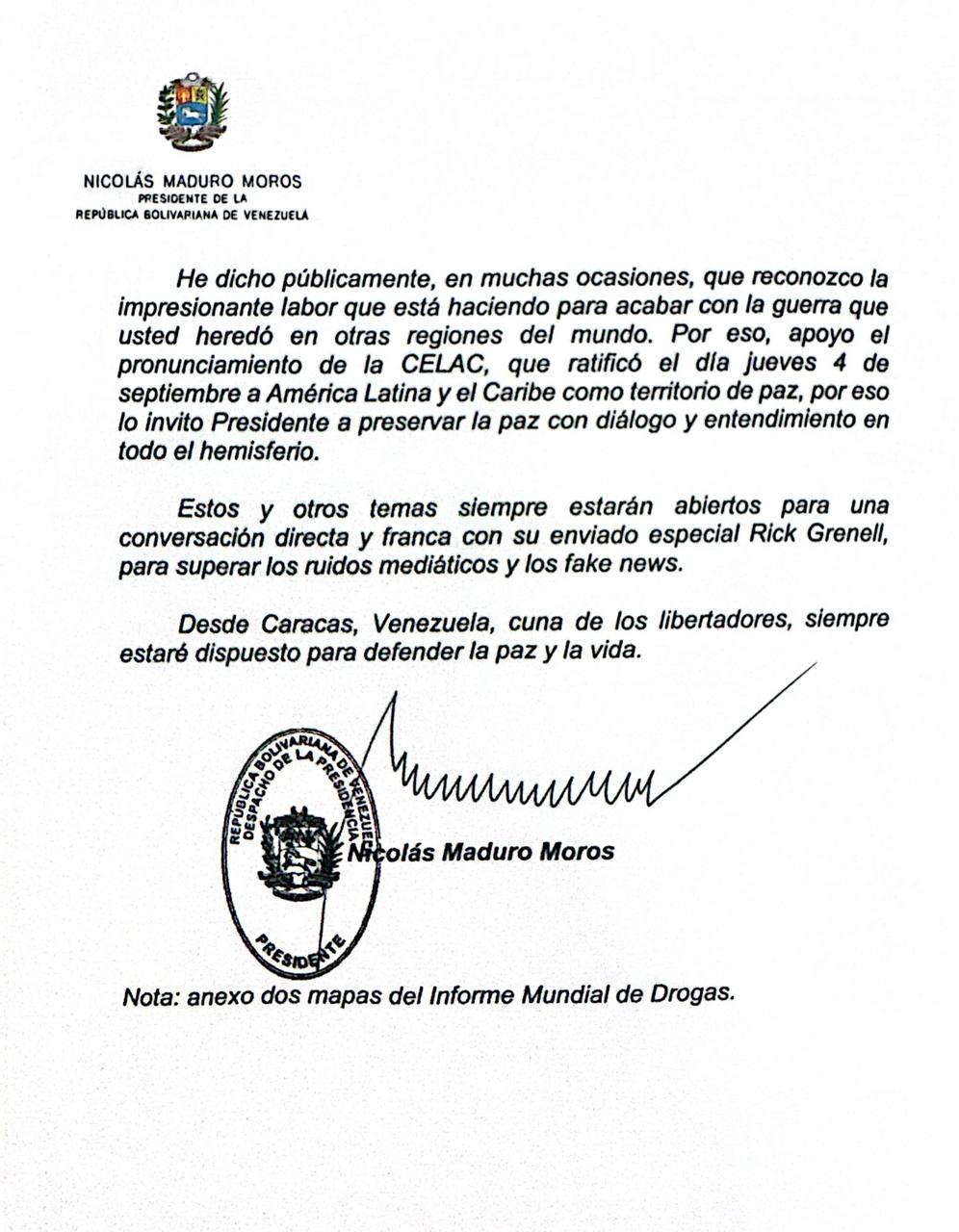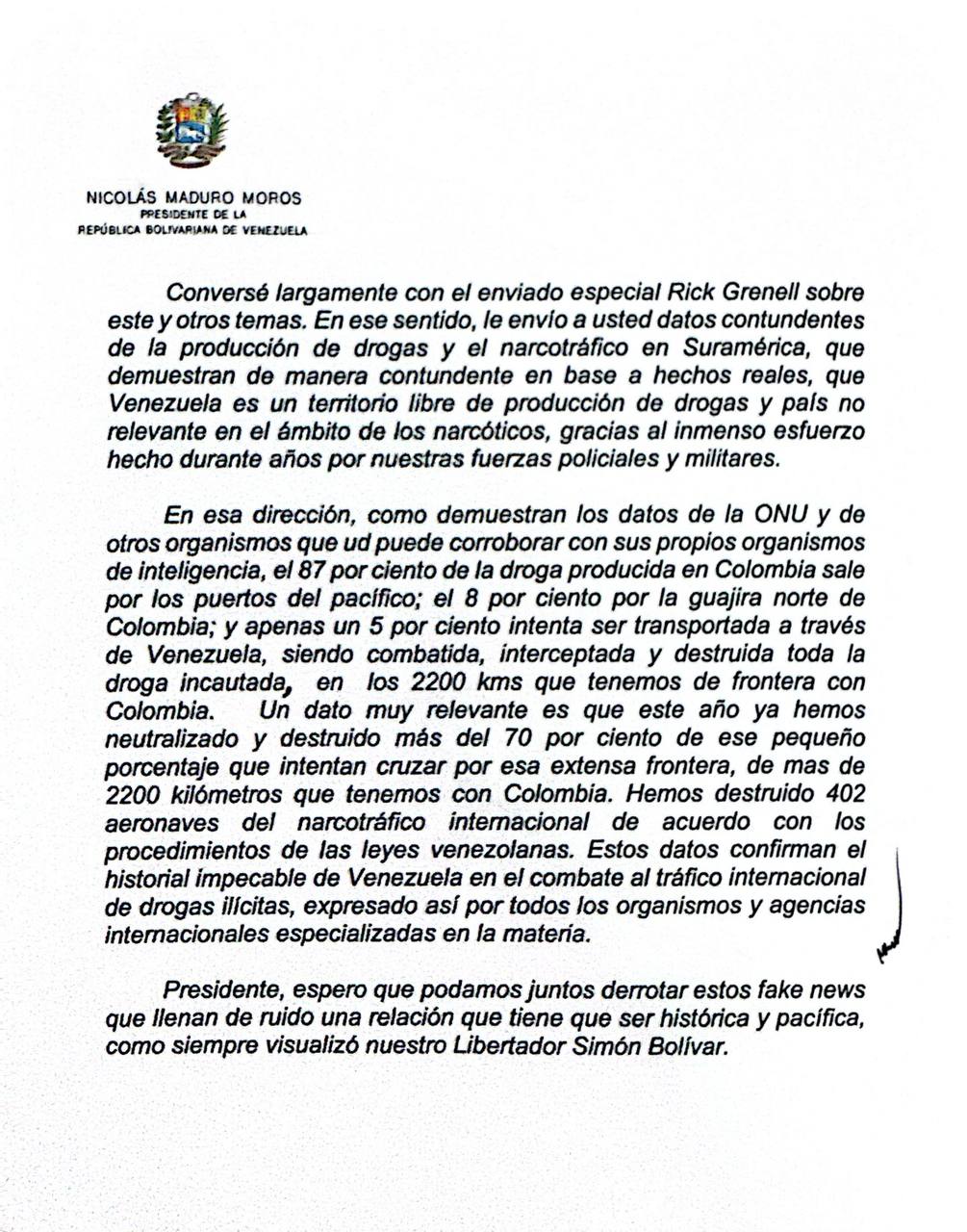 De igual manera, Maduro resaltó en el escrito el «inmenso esfuerzo hecho durante años» por las autoridades venezolanas para que Venezuela no sea «relevante en el ámbito de los narcóticos».
