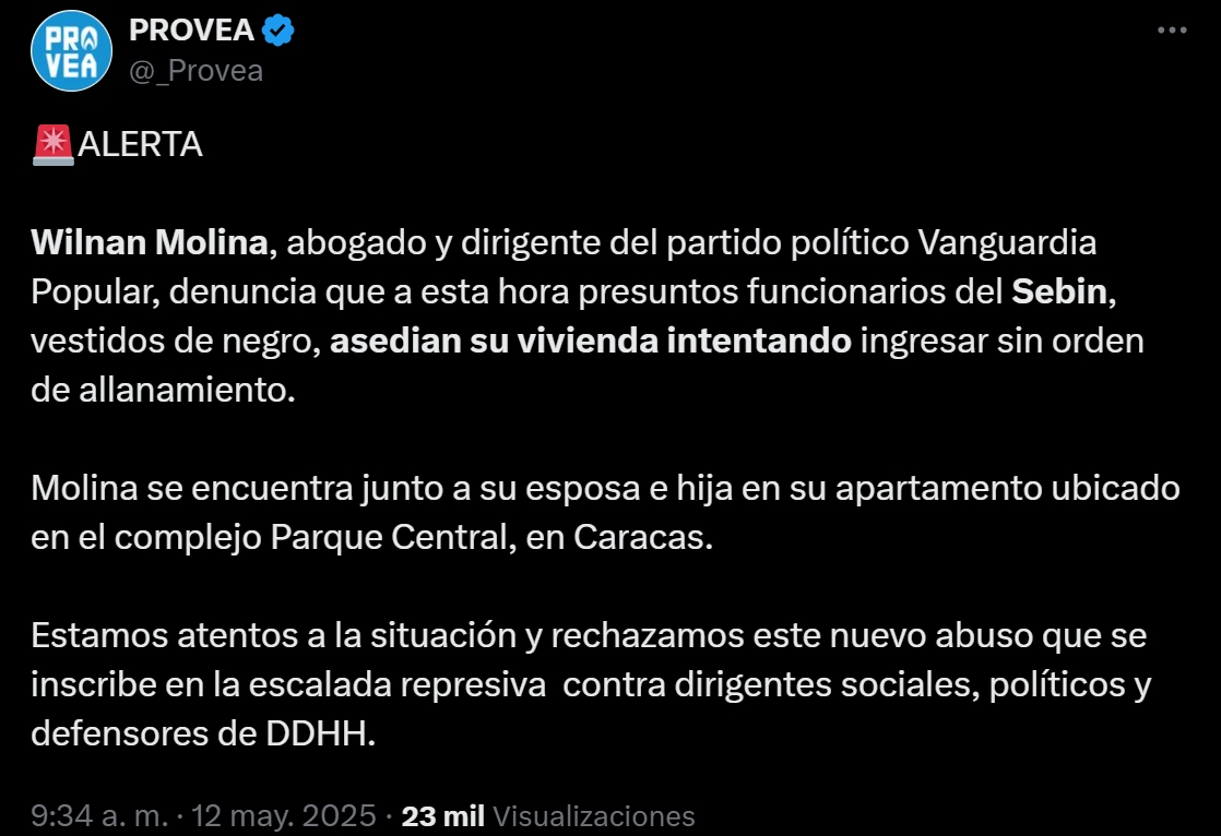 «Wilnan Molina denuncia que a esta hora presuntos funcionarios del Sebin, vestidos de negro, asedian su vivienda intentando ingresar sin orden de allanamiento», expuso Provea.