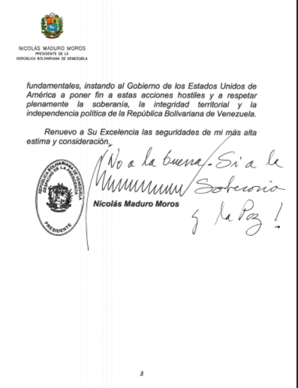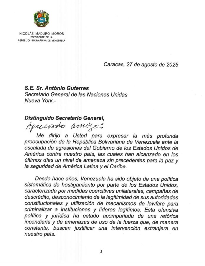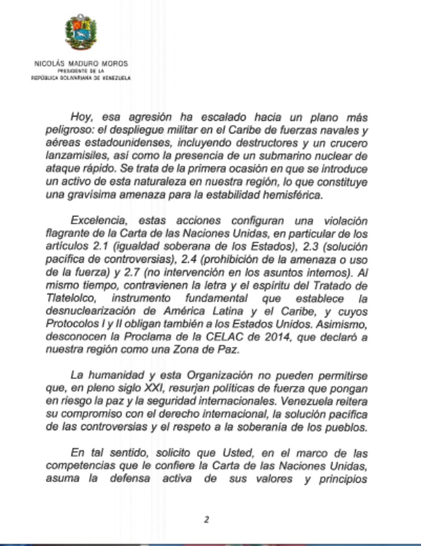 «Me dirijo a usted para expresar la más profunda preocupación de Venezuela ante la escalada de agresiones del Gobierno de los Estados Unidos contra nuestro país, las cuales han alcanzado en los últimos días un nivel de amenaza sin precedentes para la paz y la seguridad de América Latina y el Caribe», indicó Maduro en la carta.