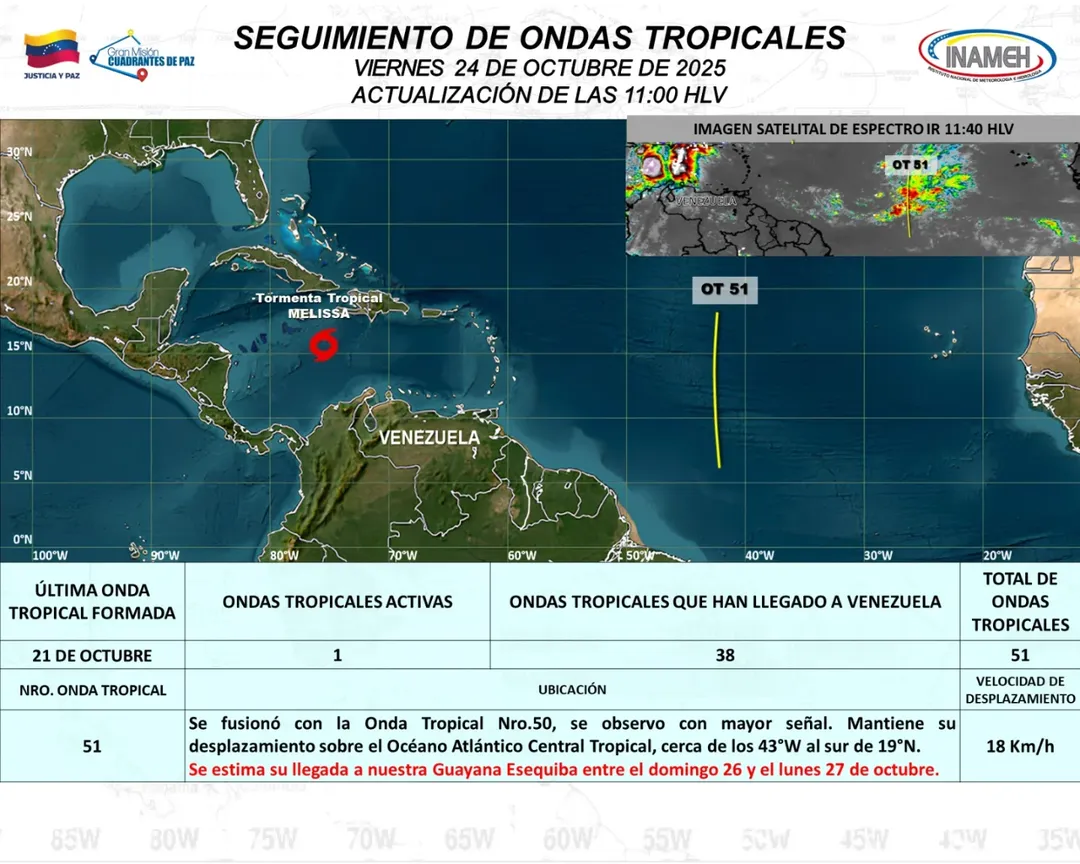El Instituto Nacional de Meteorología e Hidrología (Inameh) informó este viernes que la tormenta tropical Melissa se encuentra a 720 kilómetros al noroeste de la península de Paraguaná.