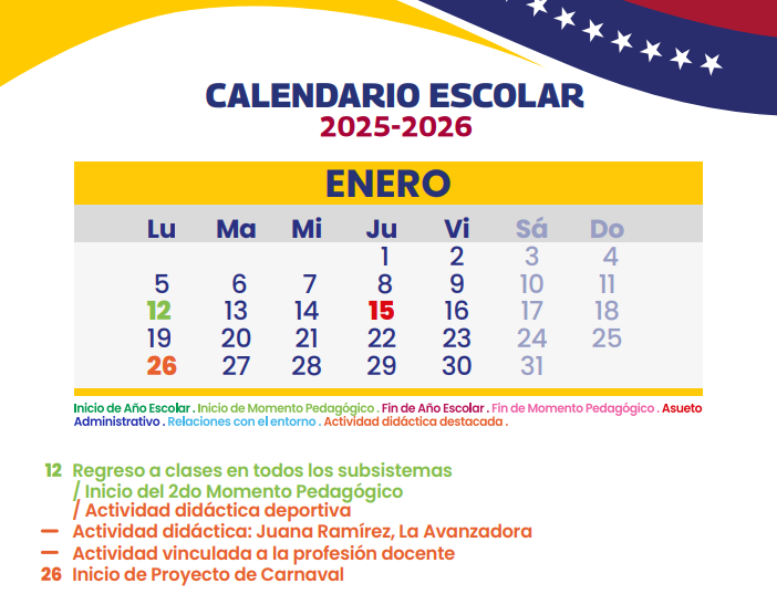 De acuerdo con el documento, ese día iniciará el segundo momento pedagógico. No obstante, el jueves de esa misma semana, 15 de enero, no habrá clases por celebrarse el Día del Maestro.