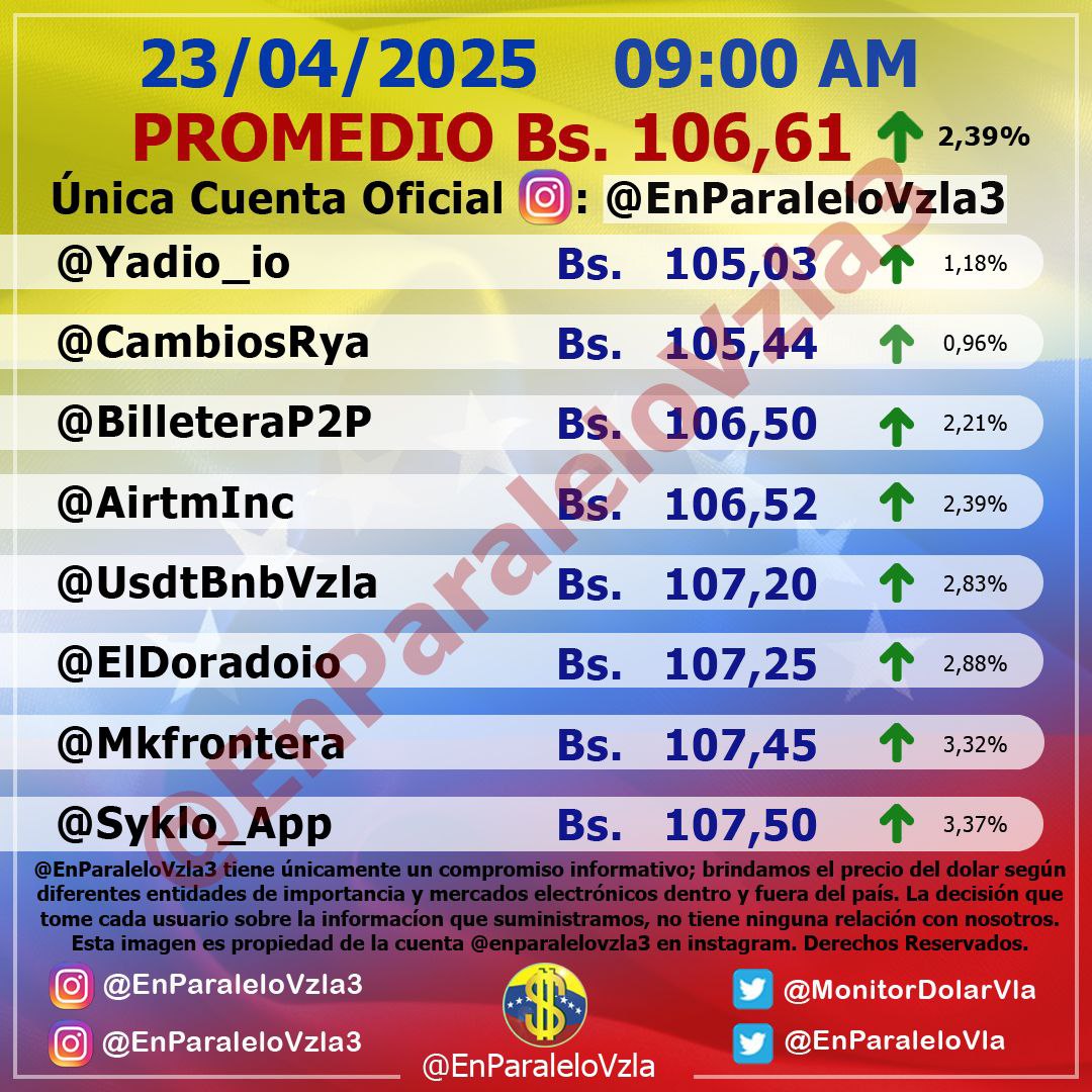 Las ocho cuentas que promedia este marcador del dólar paralelo (@Yadio_io, @AirtmInc, @ElDoradoio, @UsdtBnbVzla, @BilleteraP2P, @Syklo_App, @Mkfrontera y @CambiosRya) registraron comportamiento positivo al subir entre 0,96 % y 3,37 %.
