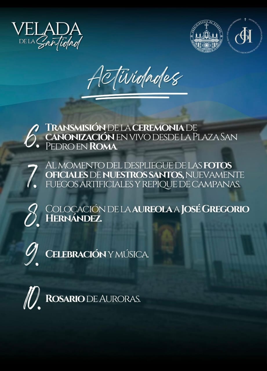 El próximo domingo 19 de octubre, el templo será el epicentro de la fe nacional al acoger la «Velada de la Santidad». Este es un evento extraordinario para transmitir en pantalla gigante y en directo desde Roma la elevación a los altares de los dos primeros santos venezolanos. San José Gregorio Hernández y Santa Carmen Rendiles.