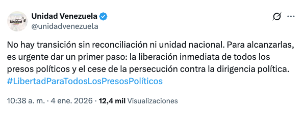 En una publicación en X, la agrupación opositora mayoritaria afirmó que «no hay transición sin reconciliación ni unidad nacional» y alcanzar ambas cosas «requiere de la liberación de los presos políticos y el cese de la persecución contra la dirigencia política».