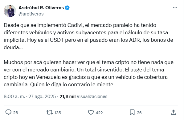 «El auge del tema cripto hoy en Venezuela es gracias a que es un vehículo de cobertura cambiaria. Quien le diga lo contrario le miente», concluyó.