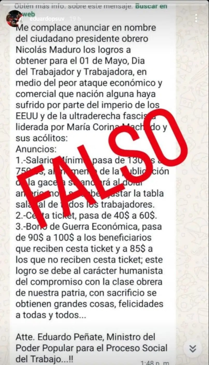 A través de sus historias en Instagram, el ministro compartió una imagen con la palabra «falso» escrito en rojo. En la misma se indicaba que el salario mínimo de los trabajadores venezolanos iba a pasar de 130 a 750 bolívares al mes. Mientras el cestaticket quedaría en 60 dólares.
