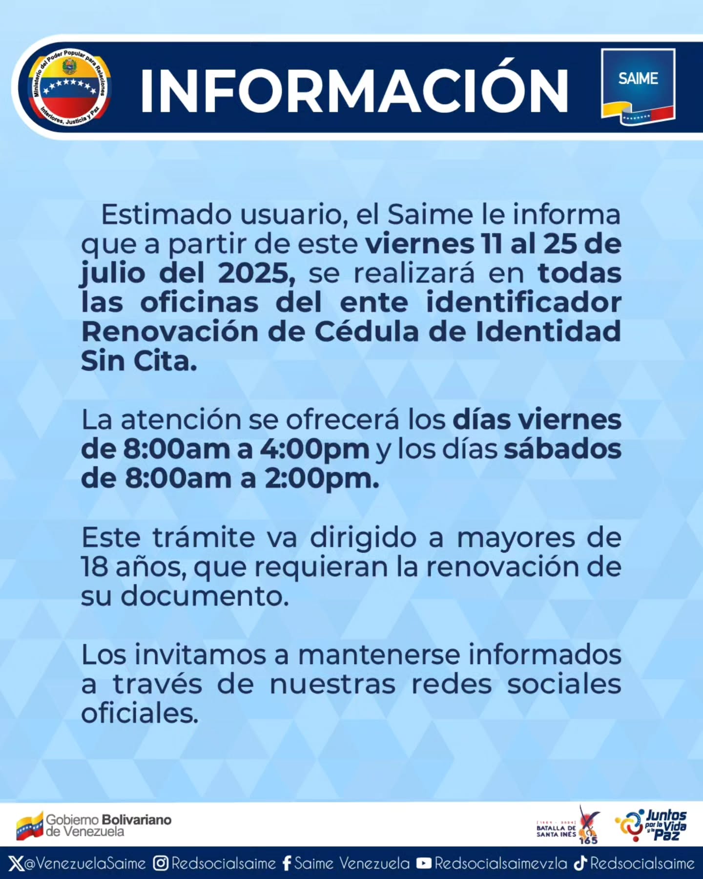El Servicio Administrativo de Identificación, Migración y Extranjería (Saime) anunció el inicio de un operativo especial para renovar la cédula, sin la necesidad de agendar una cita previa.