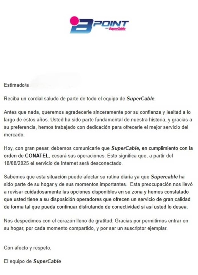 «Hoy, con gran pesar, debemos comunicarle que SuperCable, en cumplimiento con la orden de Conatel, cesará sus operaciones. Esto significa que, a partir del 18/08/2025 el servicio de Internet será desconectado», indicó la compañía en un comunicado.