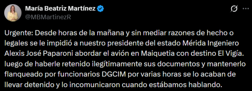 Por su parte, María Beatriz Martínez, presidenta de PJ, precisó que todo comenzó en la mañana, cuando impidieron a Paparoni abordar el vuelo. Unas horas después, habría sido detenido por organismos del Estado.