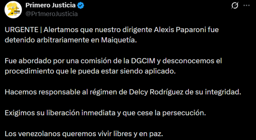 El partido Primero Justicia (PJ) denunció este jueves la presunta detención del dirigente político Alexis José Paparoni en el Aeropuerto de Maiquetía, luego de que se le impidió abordar un vuelo hacia El Vigía, estado Mérida.